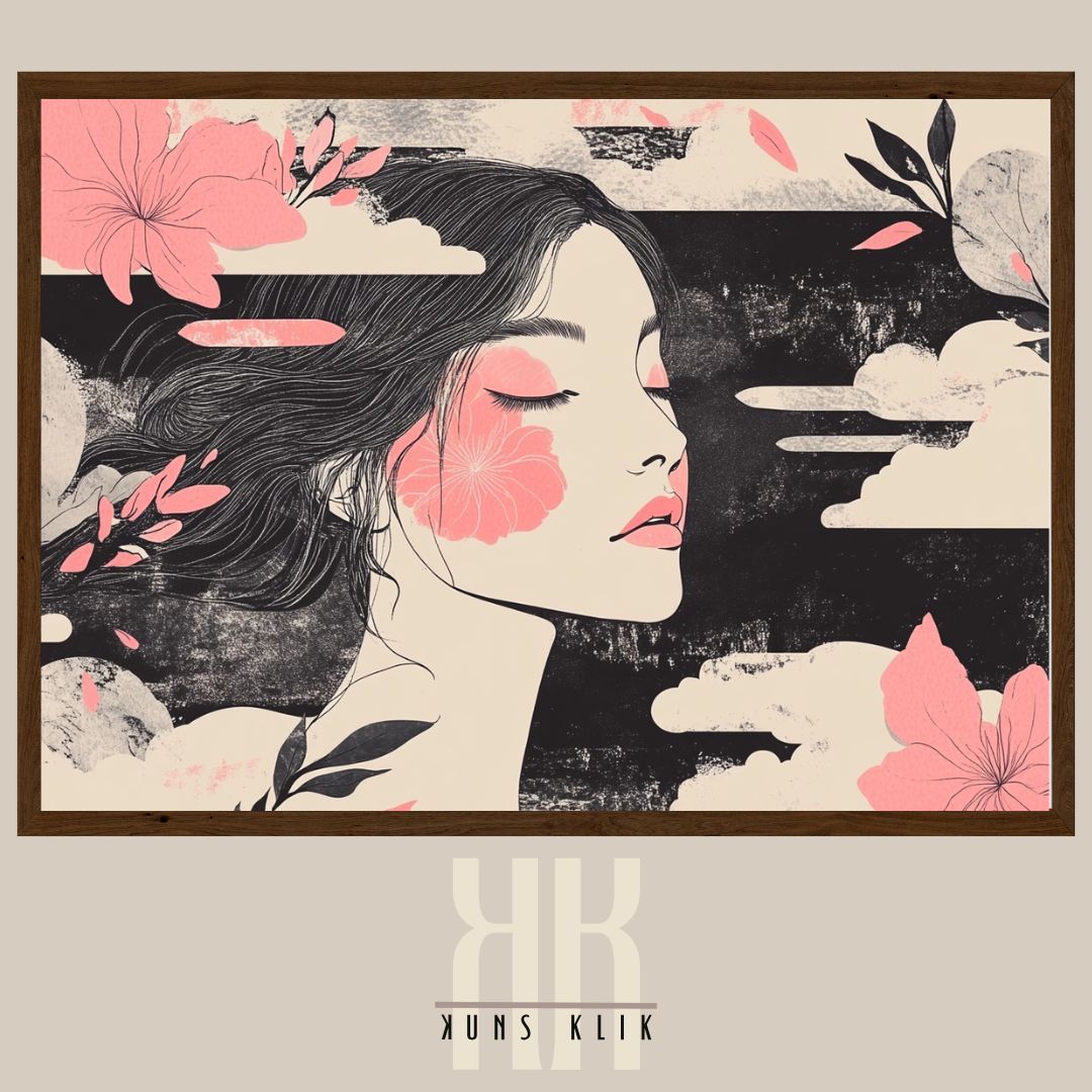 Surreal portrait art, Feminine wall decor, Floral face artwork, Surreal portrait art prints, Abstract face art print, abstract pink art, black white and pink art, Japanese-inspired art prints, Floral portrait illustration, minimalist pink art, abstract anime art